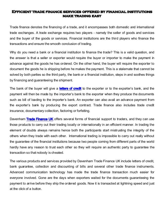 Trade finance. In Africa, virtually all banks engaged in trade finance issue letters of credit. Specifically, the survey (AfDB 2014) banks offer trade finance services to existing clients. This means that requests for trade finance are likely to come on top ... Document Viewer
